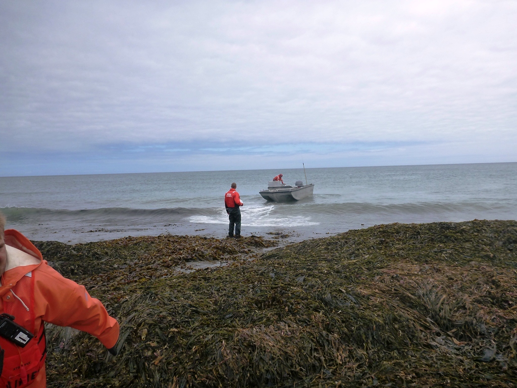 Here are a few pictures to show how we had to get off the skiff. Two of my crew mates jumped off first while I handed them our gear in between wave sets. It was not a simple task and was often interrupted by crashing waves.